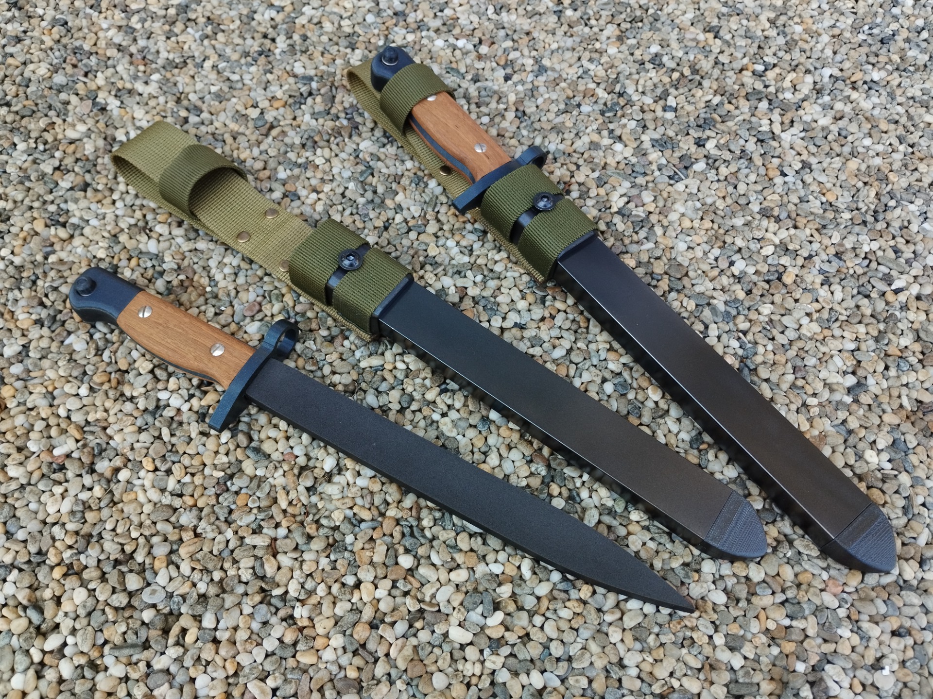 Hliníkové pouzdro pro bodáky s čepelí 10mm naší produkce. Na obrázku uprostřed, bajonet je pouze ilustrativní.